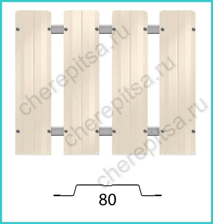 Ширина штакетин — 80мм, длина — 1500, 1750 либо 2000мм, линия верха скругленная либо прямая.